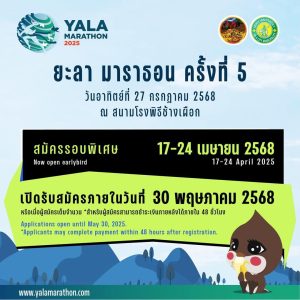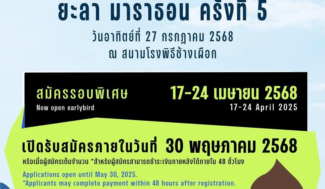 ยะลามาราธอน มาแล้วจ้า….. 25 เมษายน 2568 โดย admin / ข่าวประชาสัมพันธ์,ข่าวประชาสัมพันธ์,ข่าวฝากประชาสัมพันธ์ ยะลามาราธอน มาแล้วจ้า….. เปิดรับสมัครรอบ Early Bird (ราคาพิเศษ) วันที่ 17 เมษายน – 24 เมษายน 2568 . เปิดรับสมัครรอบปกติ วันที่ 25 เมษายน – 30 พฤษภาคม 2568 นี้ FacebookFacebookXTwitterLINELine