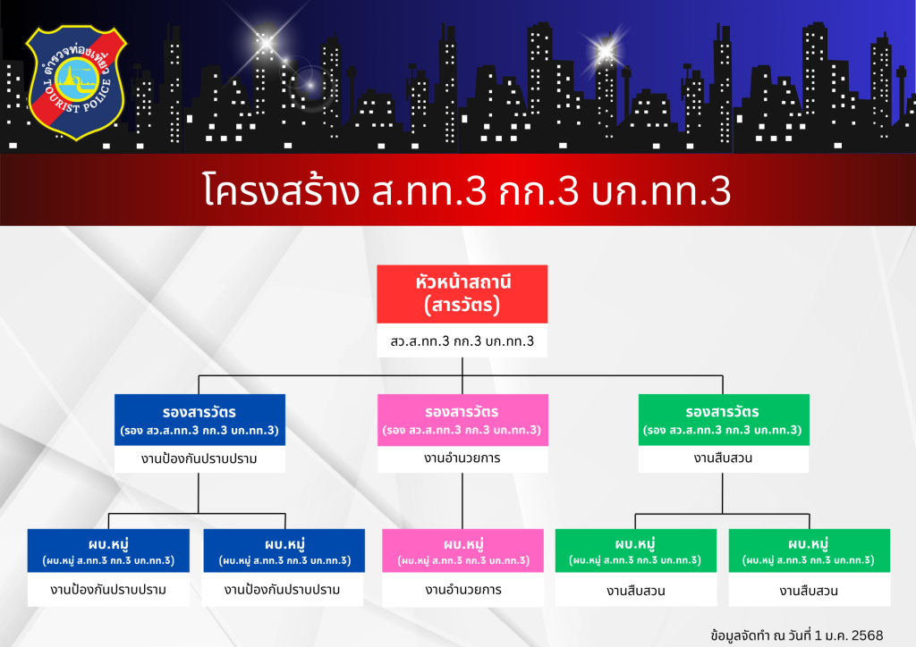 สถานีตำรวจท่องเที่ยว 3 กองกำกับการ 3 กองบังคับการตำรวจท่องเที่ยว 3 มีหัวหน้าสถานีตำรวจเป็นระดับตำแหน่งสารวัตร จึงมีการกำหนดลักษณะงานโดยสรุปดังนี้